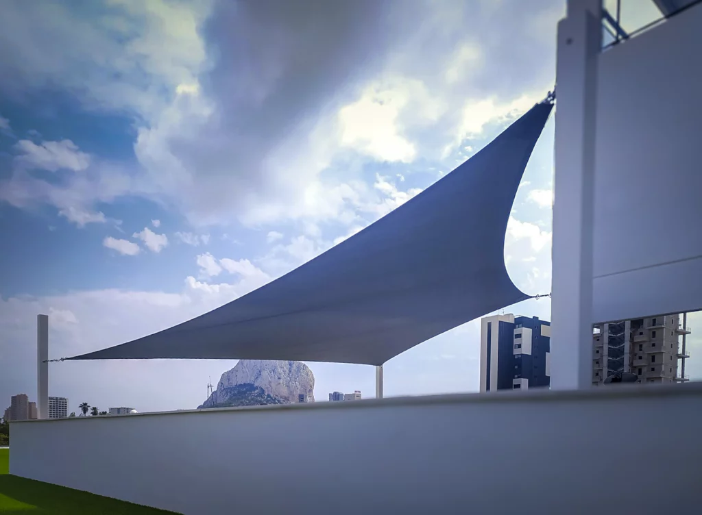 Una vela en el mundo de los toldos se refiere a una estructura de tela diseñada para proporcionar sombra en espacios exteriores, asemejándose visualmente a una vela de barco.